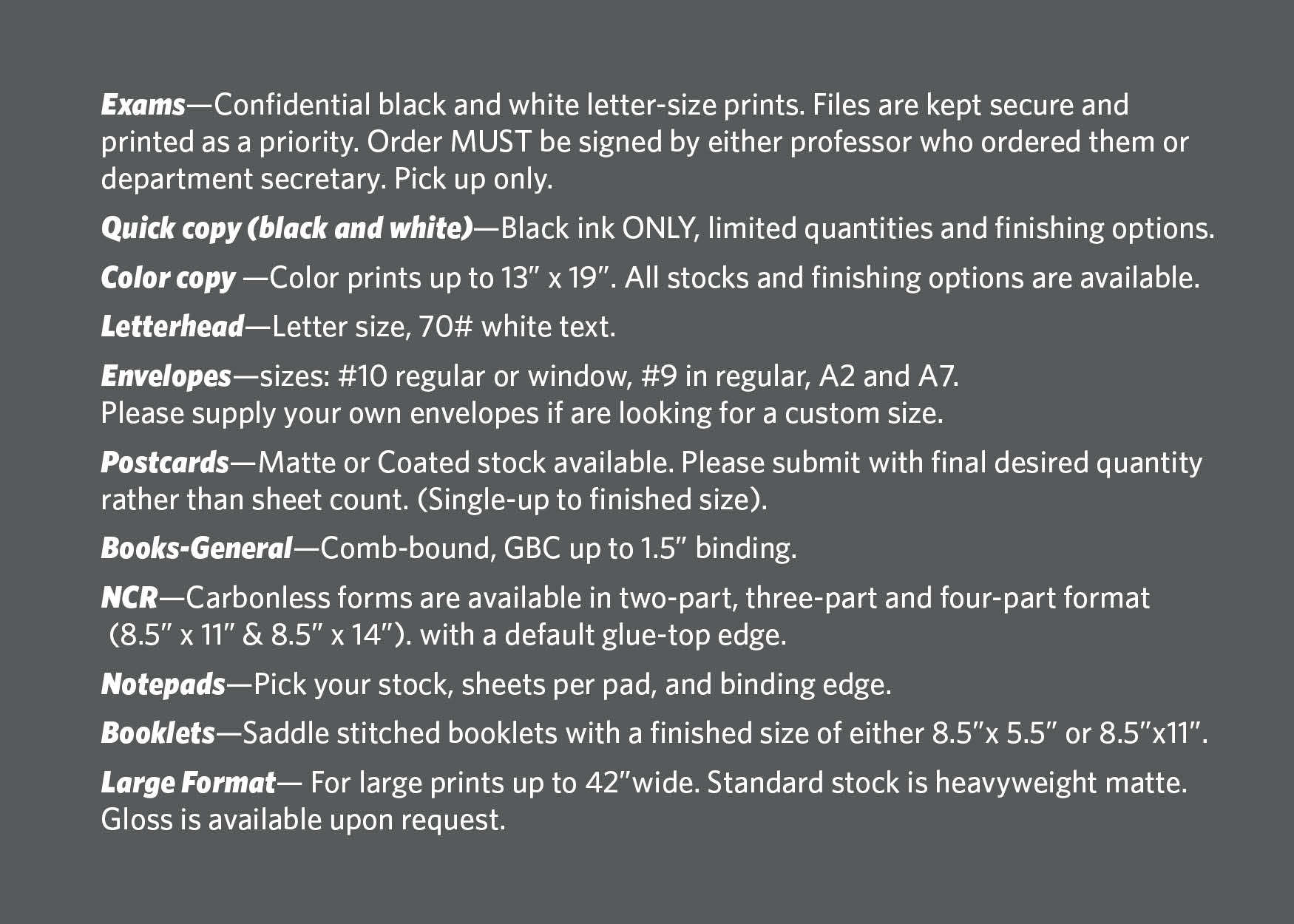 - Large format orders and exams WILL NOT be shipped.